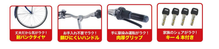 「タイヤ」は、ラクノリより肉厚な耐パンクタイヤに変更。反射材を追加しより安全に夜道を走行可能。「ハンドル」は、スチールから錆びにくいステンレスに変更。「グリップ」は、ハンドルのグリップを肉厚に変更し、手になじむ感覚を向上した。「スペアキー」は、2本から4本に増加。より多くの家族や友人とシェアできる自転車になった。