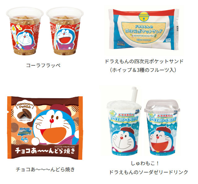 コーラ味のかき氷に、はじけるキャンディをトッピングした、パチパチ食感が楽しめる「コーラフラッペ」本体価格325円(以下同)、四次元ポケットをイメージしたフルーツサンド「ドラえもんの四次元ポケットサンド (ホイップ&3種のフルーツ入)」は250円、ドラえもんの大好物、どら焼きをチョコ味にアレンジした「チョコあ~~~んどら焼き」184円、ソーダ味のゼリーに別添の粉を入れることでしゅわもこの泡が生まれるふしぎなドリンク「しゅわもこ!ドラえもんのソーダゼリードリンク」267円などを展開する。