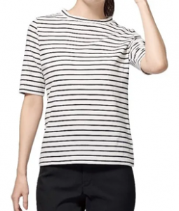 大人も着やすい、細ピッチのボーダー。インでもアウトでもバランスの良い着丈で、インナーにも最適。カラーはブルー・グレージュ・ブラック、サイズは SS・S・M・L・LL、価格は1290円。