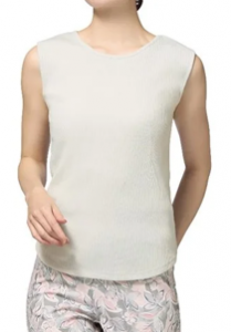 凹凸のあるリブの編地で、伸縮性があり透けにくい。肩の巾をたっぷりとっているので下着の肩ひもが見えにくく、安心して着用できる。カラーはブルー・オフホワイト・グレージュ・ブラック、サイズは SS・S・M・L・LL、価格は999円。