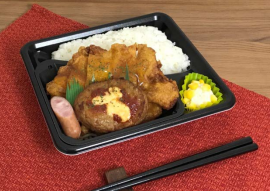 発売41年目を迎えるポプラの店炊きご飯を詰める「ポプ弁」に、ひろくまの大好きなレモンがほのかに香るタレを使用したチキン南蛮とSNSでひろくまがよく食べているピザをイメージしたピザ味のハンバーグなどを盛り込んだボリューム満点の弁当。698円(税込み、以下同じ)。