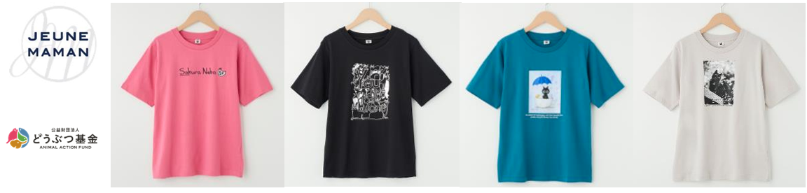ジュネママンは、いつも、いつまでも、「若々しく、素敵な自分になれる」、そんなスタイリングを提案するレディスファッションブランド。公益財団法人どうぶつ基金の「さくらねこ」のイラストと、画家のおかべてつろうさんと香月かつき和夫かずおさん、写真家のコムロミホさんのそれぞれの猫にまつわる作品をTシャツにデザインした。
