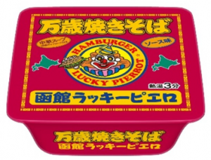 「函館ラッキーピエロ万歳焼きそば」は、ラッキーピエロの人気メニュー「万歳焼きそば」の風味をイメージした、スパイスを効かせた甘さとコクのあるソース味のカップ焼きそば。滑らかで弾力のある麺、具材にはキャベツと味付きの豚肉を使用した。湯切りのお湯でつくれるポークとチキンの旨味が特長のオリジナルスープも付いている。税込み価格は365円。