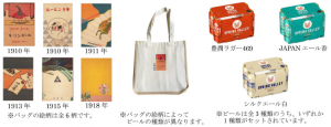 1888年(明治21年)、明治屋は「ジャパン・ブルワリー・カンパニー」(現・キリンビール株式会社の前身)で製造された「キリンビール」の総代理店契約を締結し、1926年(大正15年)まで38年間「キリンビール」を一手に販売していた。記念セットは1セット当たりビール6缶パック(350ml)×1とエコバッグ×1で1617円、限定1200セット。