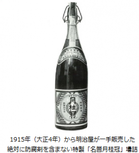 1915年(大正4年)に明治屋は壜詰め日本酒「名誉月桂冠」の一手販売契約を大倉恒吉商店(現・月桂冠株式会社)との間で結んだ。壜は1910年(明治43年)に実用新案登録され、鉄道院の駅売り酒として採用されたことで月桂冠の名が全国に広がるきっかけとなった「大倉式猪口付瓶」の形状を模した。酒質は、伏見の伝統的な製法である「四段掛法」で醸した、甘口で濃醇なコクのある風味の「吟醸酒」。