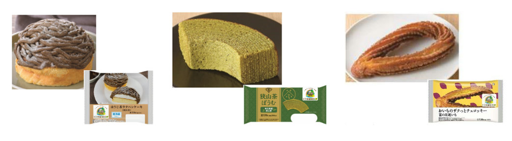 発売する商品は、埼玉県産「狭山ほうじ茶」パウダーをモンブランクリームに使用した「ほうじ茶ラテパンケーキ(狭山茶)」税込価格343円(以下同)、埼玉県産「狭山茶」入りのパウダーを使用した「狭山茶ばうむ」184円、埼玉県産「川越芋」のペースト入りの餡を使用した「おいものザクっとチュロッキー(富の川越いも)」149円の3品。