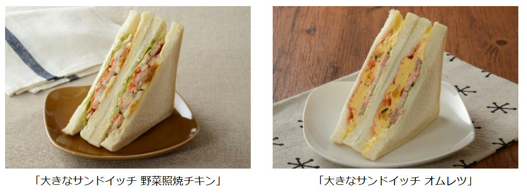昨今の物価高の中で「1品でも満足できる食べ応えのあるサンドイッチが食べたい」という顧客の要望に応えるため、大きなサンドイッチ2種を開発した。食パンの耳をあえてカットせず、通常のサンドイッチより高さで約2cm、奥行きで約1.5cm大きいパン生地を使用。パンの面積を大きくし耳まで食べられよう食パンの生地に生クリームを配合し、焼き方を工夫することで、パンの耳までふんわりとした食感で食べやすい仕様に変更した。