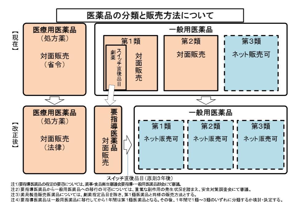 一方で、医療用から転用されて市販期間が短く副作用リスクが不明な市販薬など計20品目を「要指導医薬品」に指定し薬剤師による対面販売を義務づける。、花粉症などのアレルギー用鼻炎薬「アレグラFX」「コンタック鼻炎Z」などが含まれる。これら「用指導医薬品」は、原則3年の評価期間後に安全性が認められれば、ネットでも販売できるようになる。