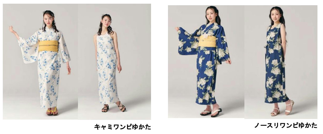 昨年大人気だった「ワンピゆかた」が今年も登場。ワンピースの上に上衣を羽織るだけゆかたになる、着付け要らずのセパレートタイプ。サイズはM~L、L~LL、3種類(サイズ別で6品番)で、価格は9800円。