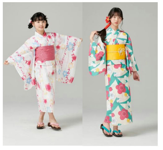 面倒なおはしょりを作らなくても、簡単に着付けができるゆかた。簡単に結べる兵児帯付き。サイズはキッズ:120cm・130cm、ジュニア:140cm・150cm、各4柄で、キッズは5800円、ジュニアは7800円。