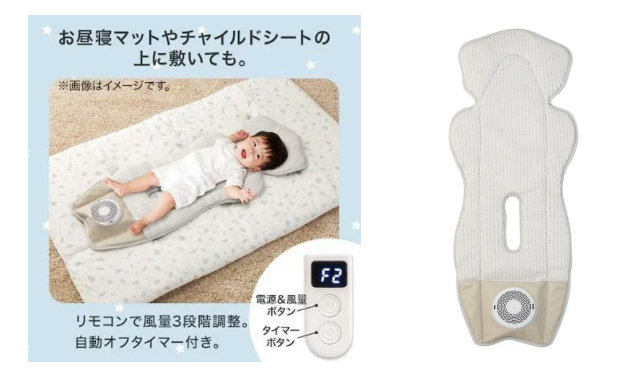 そのほか、チャイルドシートやバウンサーへの取り付けや、昼寝マットの上に敷いても使用できる。また、リモコンで簡単に操作ができ、風量は弱・中・強の3段階。リズム風の4つの動作モードがあり、30分・60分・90分のタイマー設定と連続運転が可能。