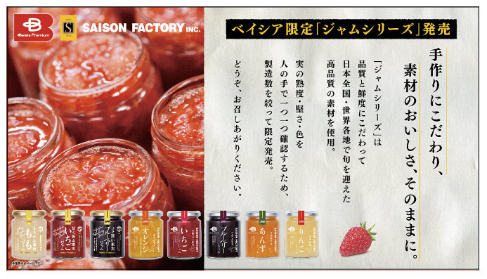(株)ベイシア(群馬県前橋市、相木孝仁社長)は6月18日(木)から、プライベートブランド「Beisia Premium(ベイシアプレミアム)」から、(株)セゾンファクトリー(山形県東置賜郡、小田切一哉代表取締役)と共同開発した「こだわりのジャムシリーズ」を販売する。