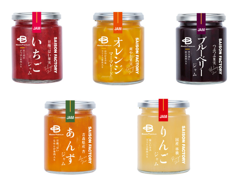 「甘酸っぱいいちごジャム」は、酸味・香り豊かなイタリア産のいちごの果汁感をそのまま活かした。「爽やかなオレンジマーマレード」は、スライスしたオレンジの皮のほろ苦さを活かして、さっぱり仕上げた。「つぶつぶブルーベリージャム」は、大粒のカルチ種を使用し、ブルーベリーの自然な甘さと香りが楽しめる。「青森県産あんずジャム」は、繊維が少なく加工に適した「大実」を使用し、酸味を活かした。「国産りんごジャム」は、国産りんごを使用し、果実感を味わえるベーシックなジャム。5品とも240gで538円。