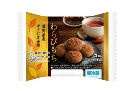 「わらびもち(滋賀県産ほうじ茶使用)5個入」は、滋賀県産ほうじ茶を使用したわらびもち。わらびもちに滋賀県産ほうじ茶のパウダーときな粉を合わせた粉をまぶして仕立てた。本体価格で181円(以下同)。発売地域は、関西地方(滋賀県・京都府・大阪府・兵庫県・奈良県・和歌山県の一部除く)。