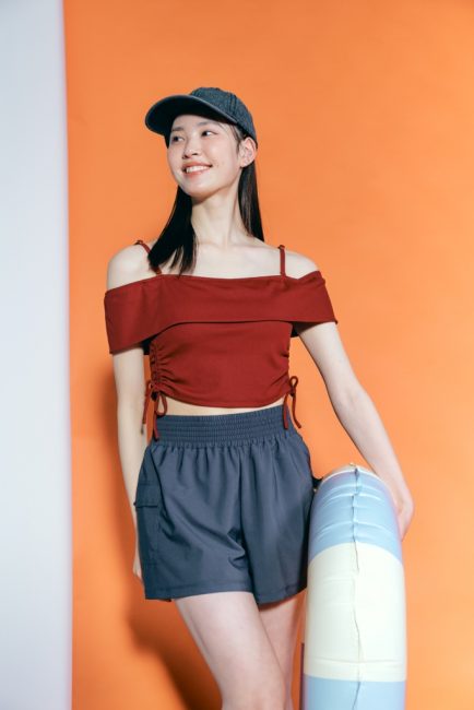 水着は、肌の露出が少なくアパレル感覚で着られるデザインがトレンド。イオンリテールでは、シアー素材やリボンなどで可愛いらしさと上品さを表現した“バレエコア”スタイルを提案する。トップス・カーゴパンツ・ショーツの組み合わせで7号・9号・11号のサイズ展開。コイアカとクロの2色を揃える。各1万2800円。