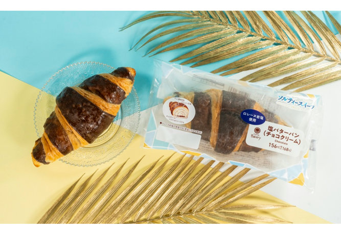 「塩バターパン(チョコクリーム)」は、デニッシュ生地とココアで色をつけたフランス生地を重ねたパンに、ロレーヌ岩塩入りの発酵バター入りマーガリンを絞って焼き上げた塩バターパンに、チョコクリームをサンドした。価格は156円。