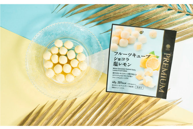 「ファミマルPREMIUM フルーツキューブショコラ塩レモン」は、レモンの美味しさをぎゅっと閉じ込めたフルーツキューブを、ロレーヌ産岩塩をきかせたホワイトチョコレートでコーティングした。価格は276円。