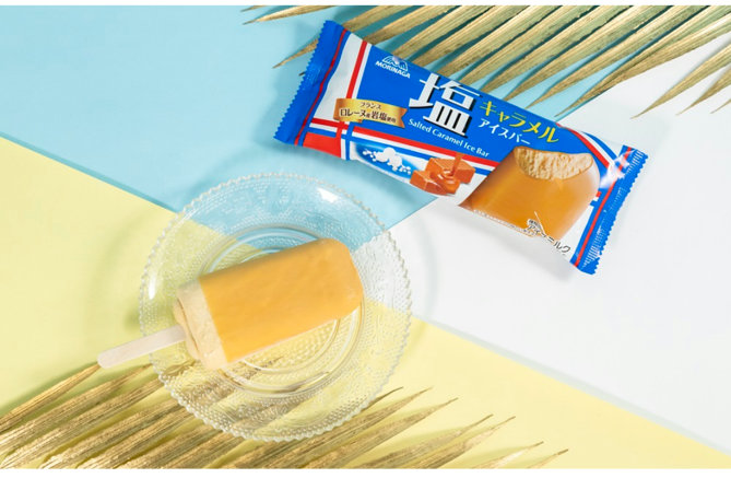 「塩キャラメルアイスバー」は、森永の「塩キャラメル」をイメージしたバーアイス。ロレーヌ産岩塩を使用した塩キャラメルアイスに、キャラメルチョコをコーティングしたシンプルな仕立て。価格は165円。