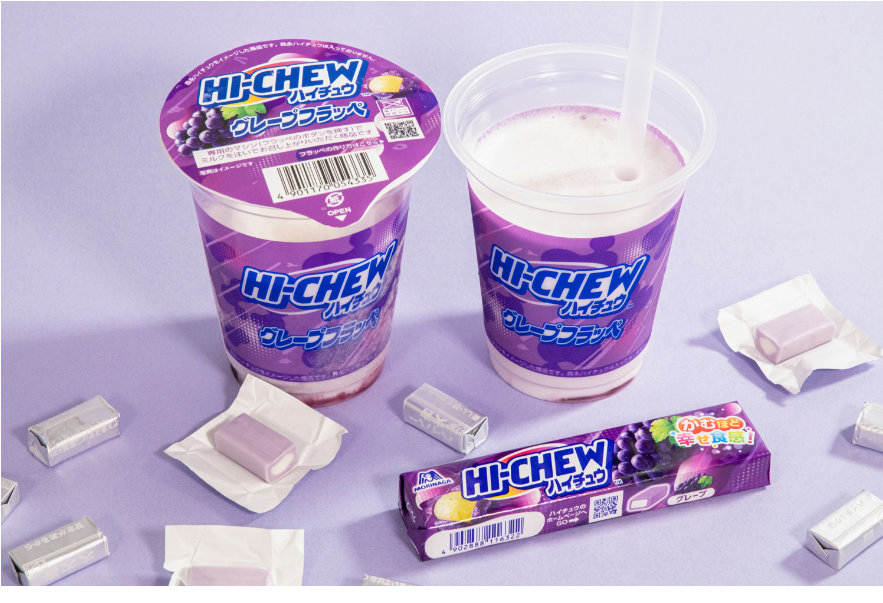 発売する「ハイチュウグレープフラッペ」は、「ハイチュウ」ならではのジューシーで濃厚なグレープの風味を再現するため、アイス部分には「ハイチュウ:グレープ」と同じ2種類のブドウ果汁を使用し「ハイチュウ:グレープ」の味わいを再現した。さらに、実際の「ハイチュウ:グレープ」の甘味度と酸味度を数値化し、その比率をフラッペにも適用することで、甘さと酸味の絶妙なバランスを再現している。本体価格で334円。