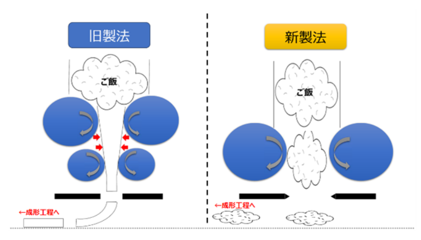 成形前のご飯をシート状にする工程で、ご飯にかかる圧力を緩和するなどの工夫を施した。従来と同じご飯の量で体積比が約3割アップしている。米の粒立ちが良くなり、ふんわりとした食感になった。
