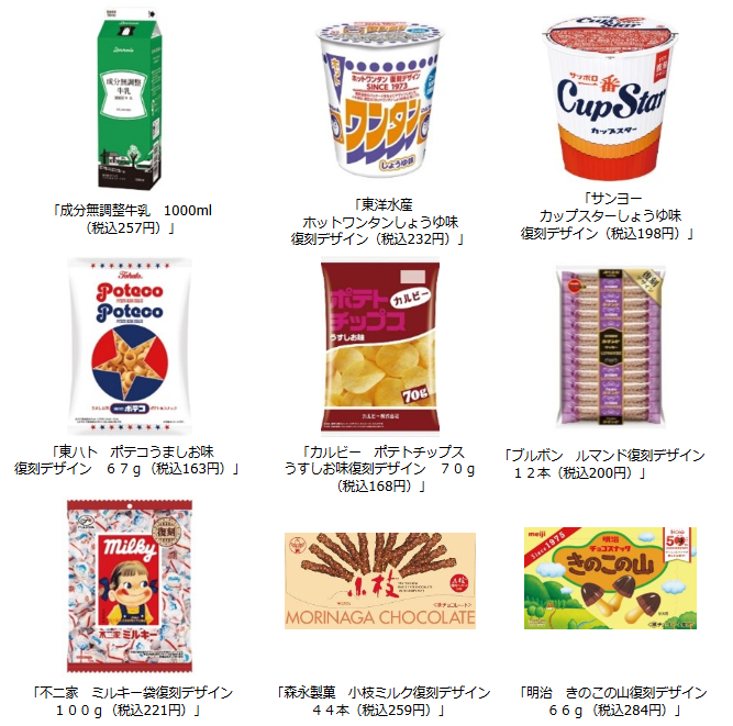 復刻版は牛乳をはじめ、50年に渡ってロングセラーとなっているナショナルブランドの菓子・カップ麺の9品。