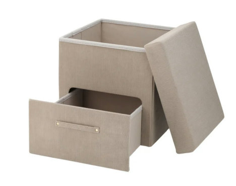 「引き出し付き折りたたみベンチボックス」は、片方ずつフタを開閉できるのがポイント。サイズ(約)は幅76×奥行38×高さ38cm、たたんだ時は高さが10cmになる。価格は5990円。ネット限定商品。