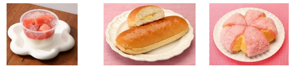 さっぱり仕立てた杏仁豆腐の上に長野県産スイカ※の角切りとゼリーをトッピングし、レモンのクラッシュゼリーを上掛けした「長野県産スイカの杏仁豆腐」373円、バターをたっぷりと練り込んだ生地で、長野県産ふじりんご※のジャムとバター入りクリームをサンドした「バター味わうコッペ(長野県産ふじりんごのジャム&バター)」160円、さっくりとした食感のビスケット生地を花びらのように仕立て、長野県産りんご(ムーンルージュ)のジャムを包みこんだ、7限目のフルール監修の「ちぎれるメロンパン(長野県産ムーンルージュりんごのジャム)」160円。
