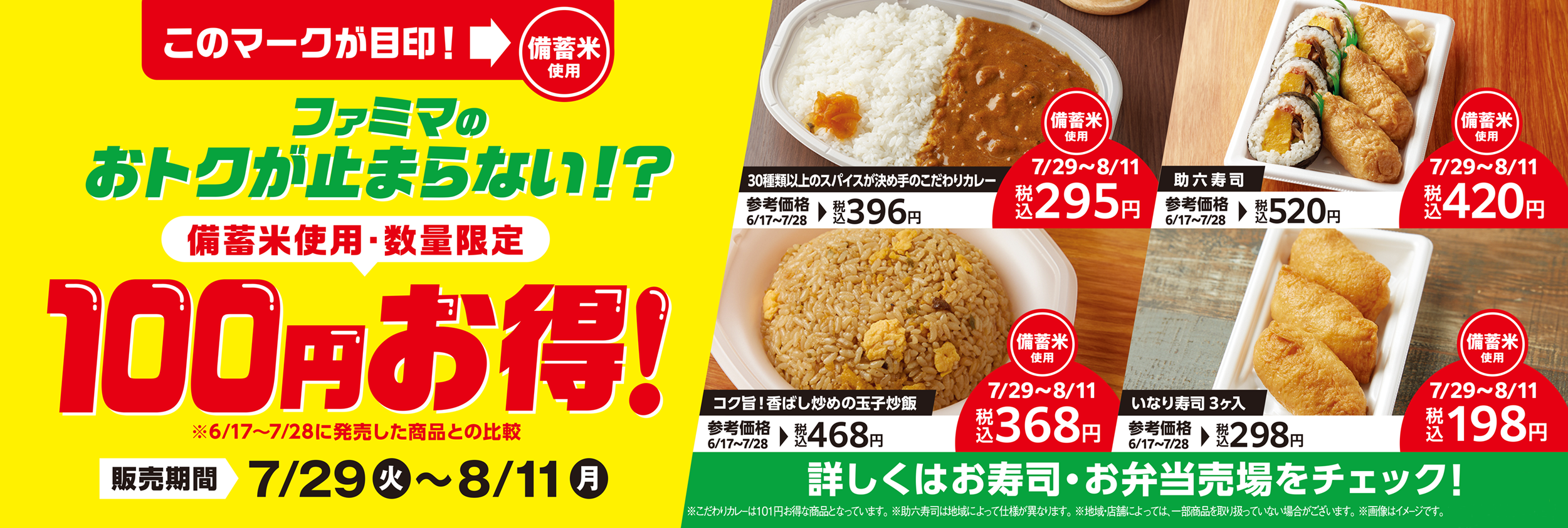 また「コク旨!香ばし炒めの玉子炒飯」341円、「いなり寿司3ヶ入」184円、「助六寿司」389円など、備蓄米を使用したメニューは参考価格より100円割安な価格で提供する。