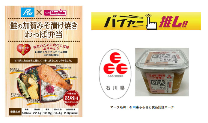 「鮭の加賀みそ漬け焼きわっぱ弁当」は、米は石川県ゆめみづほ、玉子焼きは能登の工場で製造、味噌焼きの味噌は石川県ふるさと食品認証商品のJA加賀【大地の華】を使用している。また弁当の製造は、石川県川北町にあるマックスバリュ北陸の弁当工場で作られる。