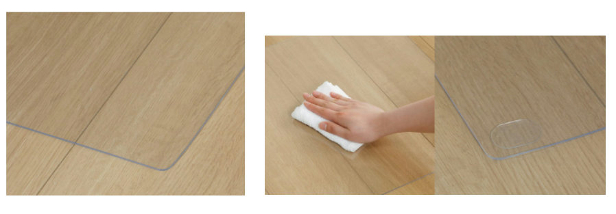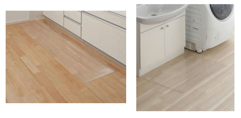 「Athena Life 透明キッチンマット」「Athena Life 透明洗面台マット」の最大の特長は、透明タイプでフローリングの木目やタイルのデザインをそのまま見せることができ、空間になじみやすい点だ。表面にはエンボス加工と撥水加工が施され、滑りにくく手入れも簡単。