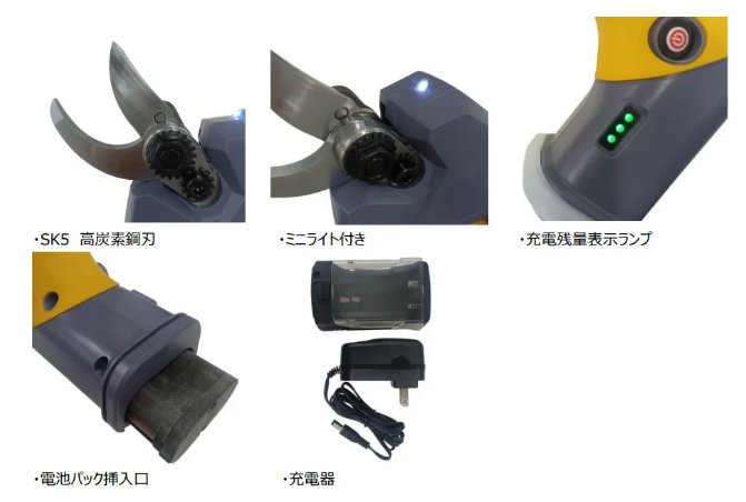 電動剪定鋏は、手動より数倍速くスムーズな剪定が可能だが、「電動剪定鋏は重くて手首や腕がすぐ疲れる」との声から、重量を約760g、従来同社製品と比べ約38%軽量化した「充電式軽量剪定鋏」を商品化した。