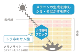 トラネキサム酸とは、肌荒れを防ぎ、シミの原因にアプローチする成分で、メラニンの生成を抑える。シミ・そばかす・肌荒れを防ぎたい人におすすめ。30ml、3300円(税込み、以下同じ)。