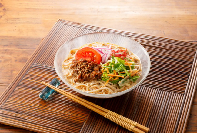 同商品は、和の「そば」、洋風の「クリーミーなスープ」、そして中華料理の「担々麺」といった和・洋・中の要素を融合させた、新感覚の冷やし麺。和食の定番である「そば」を担々麺風にアレンジした。