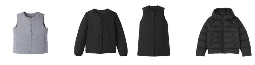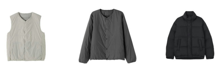 ノーカラーベストおよびノーカラージャケットは、表地を三層構造のステッチレス仕様に改良したことで、ダウンの吹き出しや毛羽立ちを防ぎ、着ぶくれしにくくすっきりとした印象に仕上げる。さらに縫い目が少ないので雨などの水分や冷気の侵入も防ぎやすくなっている。また、ベスト・ジャケット・ロングベストはサイドポケットに、フード付きジャケットは内ポケットに本体を収納できるので、持ち運びにも便利な仕様となる。