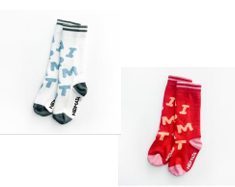 ブランドロゴを総柄でデザインしたハイソックス。カラーはホワイト・レッドの2色、サイズは15cm~20cm。価格は3足よりどりで1078円、1足では418円。