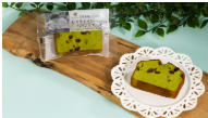 ピスタチオの風味が香るパウンドケーキ。フリーズドライのいちごの酸味が味のアクセントになっている。ナッツ系の味わいを強調するために、アーモンドプードルも生地に加えた。248円。