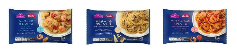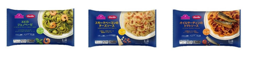 「トップバリュ エビのジェノベーゼ」337gは、イタリアジェノバの代表的なパスタ料理 濃厚なジェノベーゼソースに海老やジャガイモ、インゲンを合わせた。「トップバリュ スモークベーコンのチーズソース」304gは、ソースの上に、スモークをきかせた ベーコンチップをトッピングし、程よい塩味と香り豊かなパスタに仕上げた。「トップバリュ オイルサーディンのトマトソース」326gは、シチリア島の伝統的なトマトソースを使った香り豊かなパスタ。オイルサーディンの塩味とソースが絶妙なバランス。