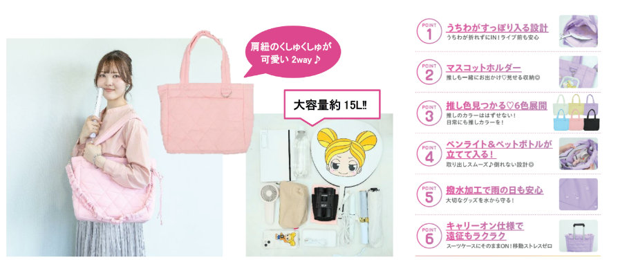 「#推しごとーと」の特徴は、ライブやイベントでの“推し活”シーンを想定した収納力とデザイン性を備えるほか、通勤・通学など日常生活にも馴染む機能性を兼ね備えている。また、ノートPC、ドリンクボトルが収まる仕切りを設けるなど、学生や社会人の普段使いにも便利な仕様となる。カラーはオフホワイト、ベージュ、ピンク、サックス、ラベンダー、ブラックの6色で、サイズは約15ℓ。税込価格で2500円(以下同)。