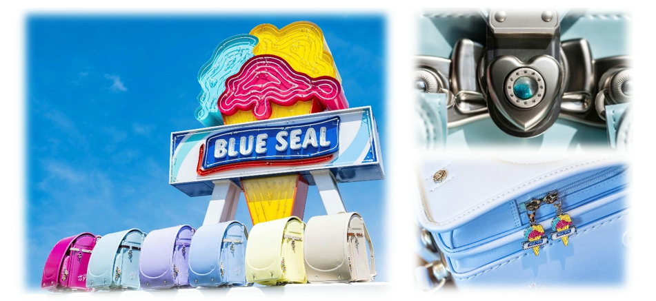 「ブルーシール×琉球ガラス工房雫×くるピタランドセル」は、「ブルーシールアイスクリーム」の6つの人気フレーバーをイメージした本体カラーに、くるっと簡単に開閉できる「くるピタ」のパーツに、沖縄の美しい伝統工芸品である琉球ガラスを採用したランドセル。本体カラーと琉球ガラスの組み合わせを選ぶことで、自分だけのオリジナルランドセルを作ることができる。本体価格で6万5000円。