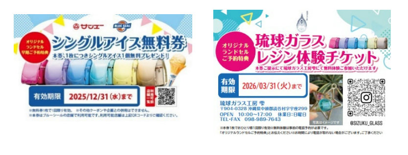 (株)サンエー(沖縄県宜野湾市、豊田沢社長)と(株)マツモト(松本勝社長)、フォーモストブルーシール(株)(村上琢磨社長)、琉球ガラス工房雫(兼次直樹代表)の4社は、「くるピタランドセル」に「ブルーシールアイスクリーム」をイメージしたカラーやデザインと、「琉球ガラス」を組み合わせた商品を共同開発した。