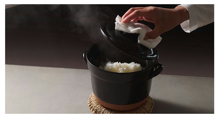 3つ目は、電子レンジでも炊ける点だ。耐熱性の高い陶土を使用しているため、電子レンジでも炊くことができ、さらに余ったごはんを入れたまま、電子レンジで温め直しもできる。4つ目はおひつとしても使用できる点だ。陶器の表面にある微細な孔が水分を適度に吸収することで、ごはんの保存に適した「おひつ」としての効果を発揮する。