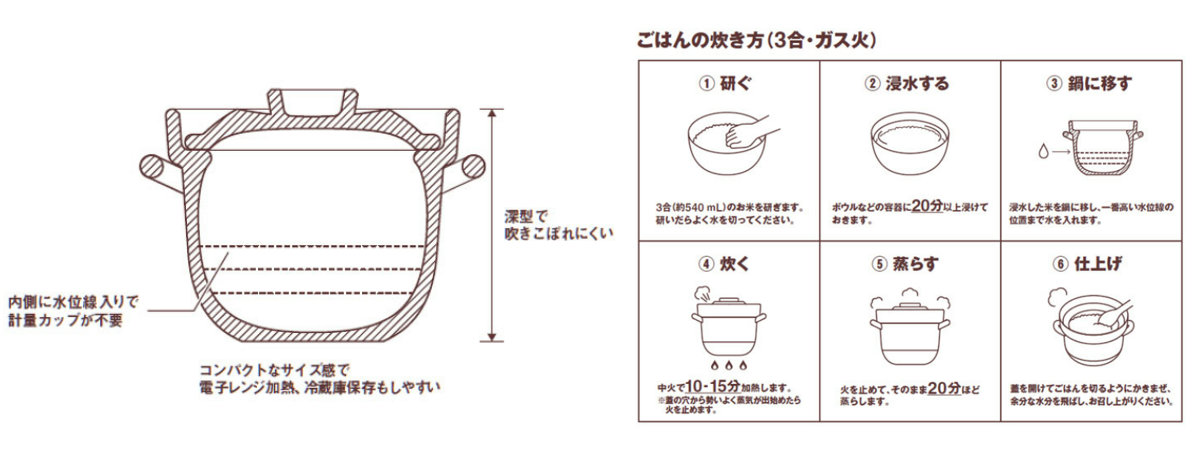 2つ目は、短時間の加熱で炊ける点だ。一般的な炊飯器に比べて、短時間の加熱で調理ができるのも「ごはん鍋」の特長だ。米を20分浸水後、中火で約12分加熱し、その後火を止めて20分蒸らすと、粒立ちの良いごはんが炊き上がる。約50分で調理が可能となる。