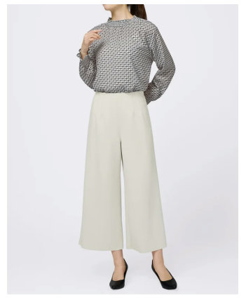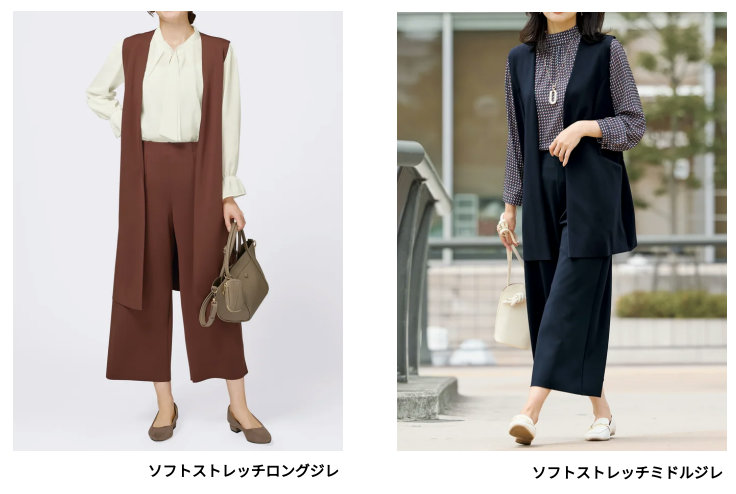 N+の「ソフトストレッチシリーズ」は、なめらかな肌ざわりとシワになりにくい素材感で人気のN+の定番アイテム。同じ素材で、ロングジレ・ミドルジレ・セミワイドパンツの3種類を展開している。