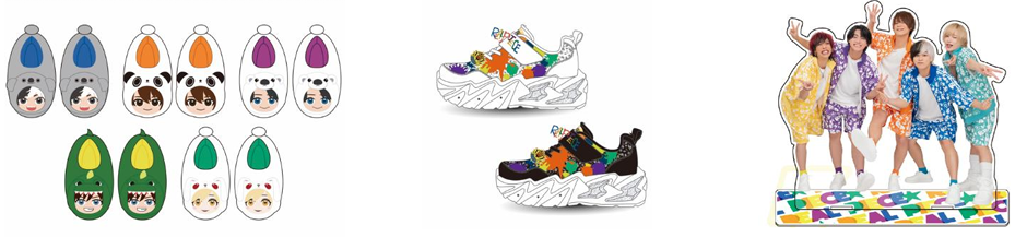 バースデイとのコラボ商品は、ルームシューズ各種(16~18㎝)が1490円。シューズ各種(16~20㎝)が3290円、デカアクリルスタンドサイズ(18×20cm)1790円など。