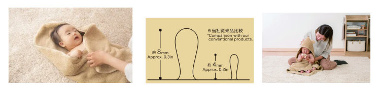 「スーパーロングパイルタオル」は、約8㎜の高さのパイルを持つニトリの人気商品。従来のタオルの2倍の高さを持たせることで、吸水力は従来品の1.6倍となる。ふんわりと包み込まれるような肌触りも兼ね備え、赤ちゃんの肌を刺激せず、やさしく水分をふき取ることができる。赤ちゃんだけでなく、家族みんなで使える新商品となる。