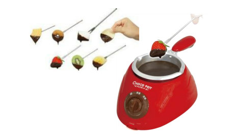 「チョコポット」では、簡単にチョコフォンデュパーティーができる。いちごやバナナなどのフルーツのほか、マシュマロやバウムクーヘンなどのお菓子をフォンデュして楽しめる。価格は1980円。