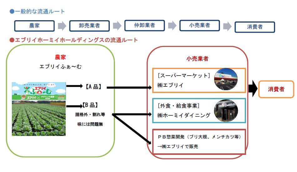 「エブリイふぁ~む」で生産された野菜は、産地からエブリイ各店へ直送される。さらに規格外・割れがあるなど、スーパーマーケットで商品として販売しにくいB品もすべて仕入れる。それらの野菜を使用したお好み焼やキャベツメンチカツ・ブリ大根など独自の惣菜開発を進める。