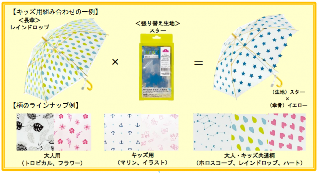 今年は、「子ども用の着せ替え傘も欲しい」という要望に応えて、新たにスマイル柄やハート柄などのキッズ用をラインナップに加えた。大人用とキッズ用で同柄のデザインもあり、親子で揃えて使用することもできる。