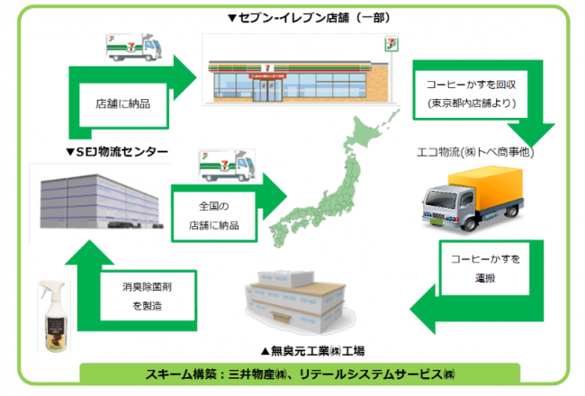 使用後のコーヒーかすを「エコ物流」で回収し、工場に運搬。製造された消臭除菌剤はセブンイレブン物流センターに運ばれ、全国の店舗に納品される。エコ物流は、セブン‐イレブンの廃棄物一元管理システムのこと。