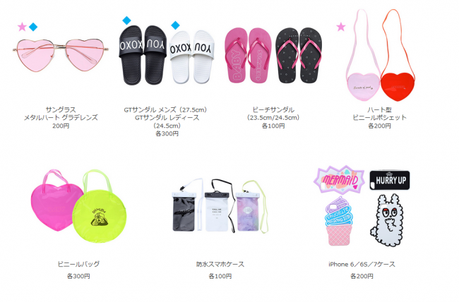 今回はその第4弾となる。企画テーマは海やプールといった夏の行楽に利用できる“安くてかわいい”商品。ビーチサンダルやハート型のサングラス、カラフルなビニールバッグや撥水性に優れたシリコーン製のiPhoneケースといった防水スマホケースなど、夏に必需のアイテムを揃える。SKE48の元メンバーの平松可奈子とのコラボ商品もある。